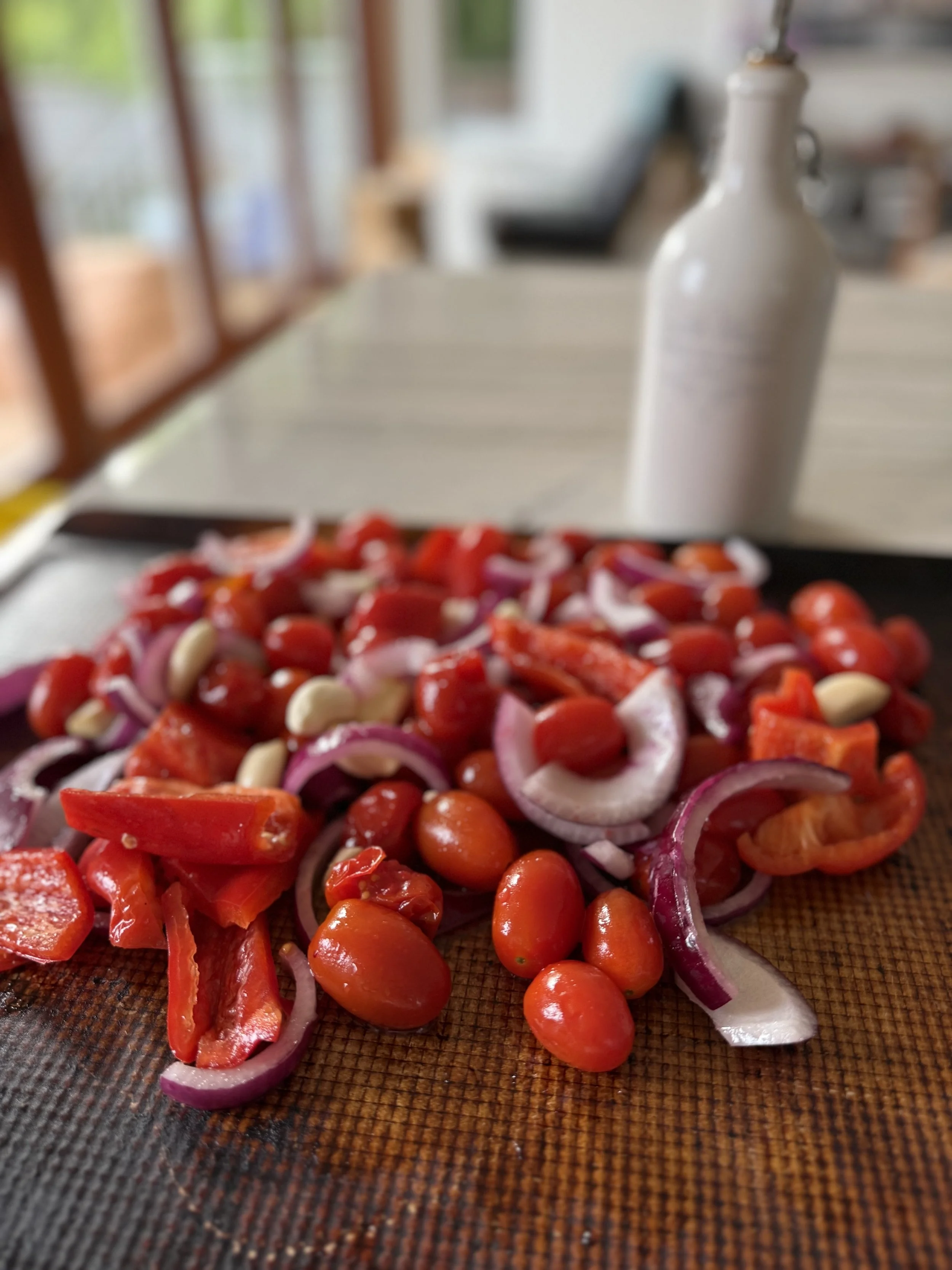 Add olive oil, tomatoes, red onion/shallots, and garlic to the pan. Sprinkle with salt, pepper, oregano, basil, and red pepper flakes. Toss with your hands to coat evenly.